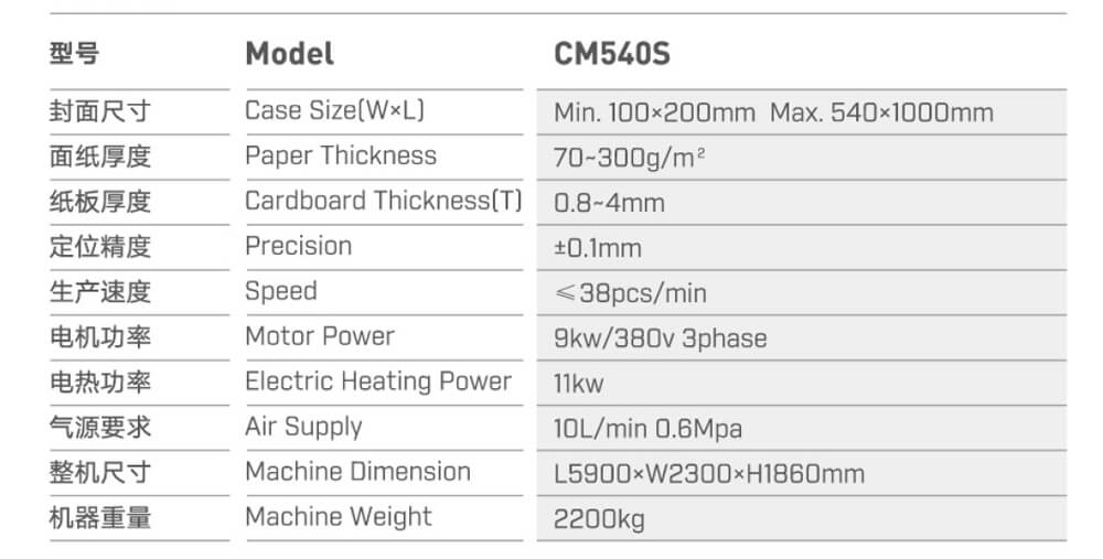 飞达送面纸、上胶,飞达送纸板,面纸与纸板定位粘合,四边包边一次完成。其具有生产速度快、需要人工少、成品美观精致、机械手影像定位装置,精准定位,提高精度等特点。可以广泛应用于制作精装书封面、酒包皮壳、烟包皮壳、笔记本、文件夹、台历、挂历等。